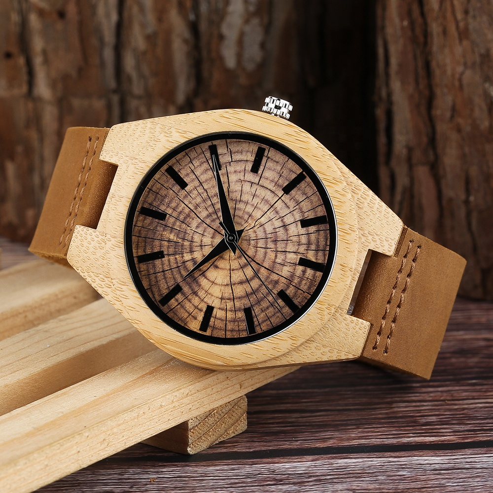 Fast Production No Logo Bamboo Wood Watch Engraving Wood Grain Leather Strap Wooden Watches For Men
